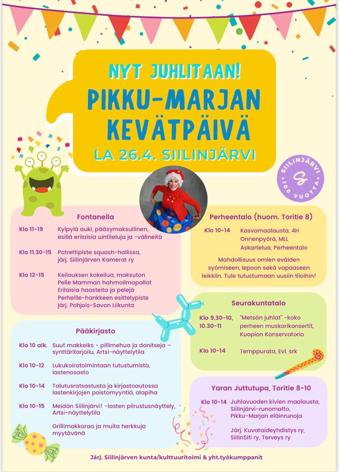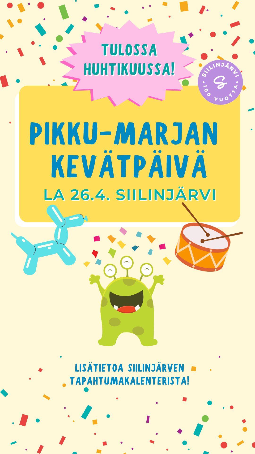 Tervetuloa mukaan Pikku-Marjan kevätpäivän tapahtumaan Siilinjärven keskustan alueelle lauantaina 26.4.2025 klo 9.30-15! MLL Siilinjärven paikallisyhdistys mukana tapahtumassa pitämässä Onnenpyörää Siilinjärven Perheentalolla. Tervetuloa!